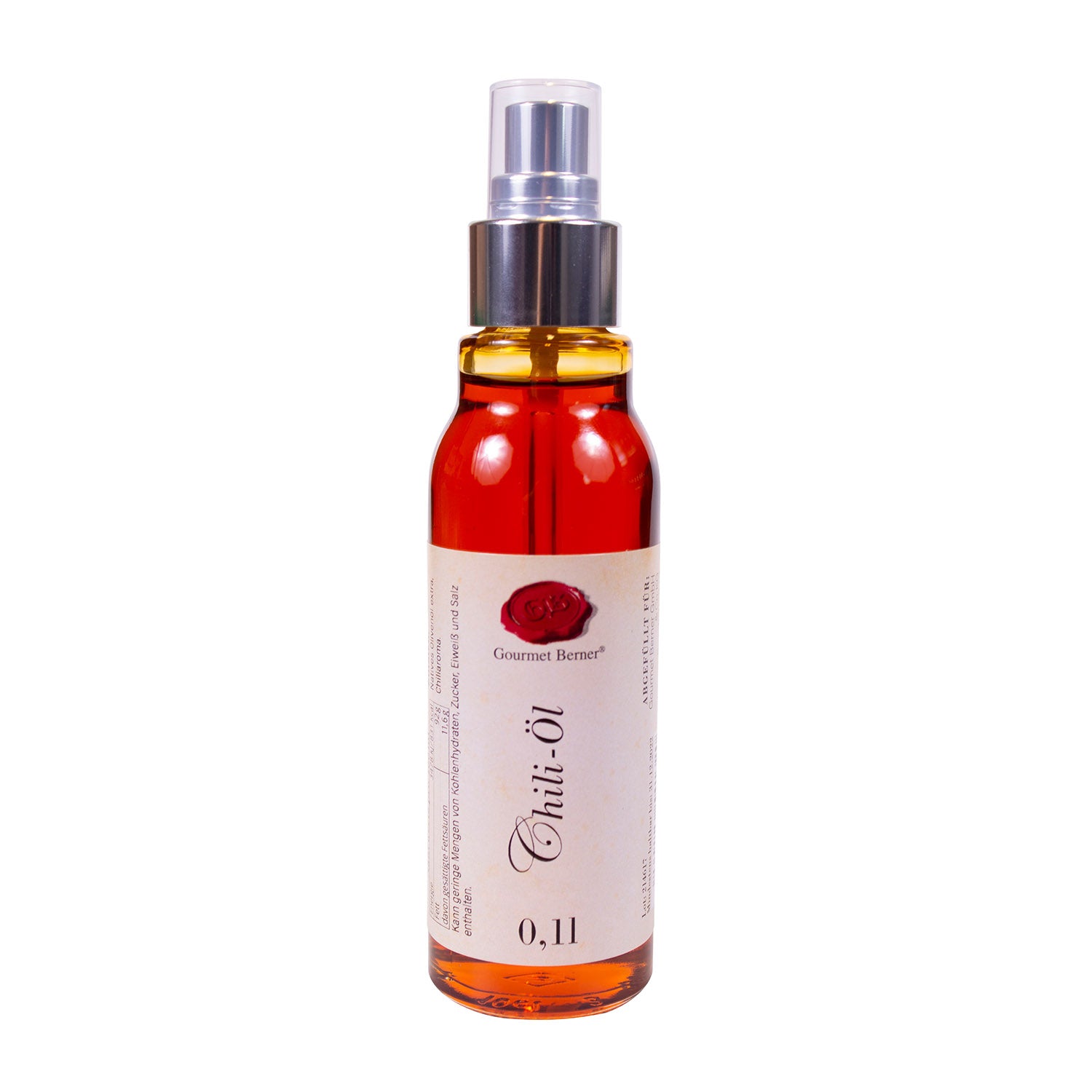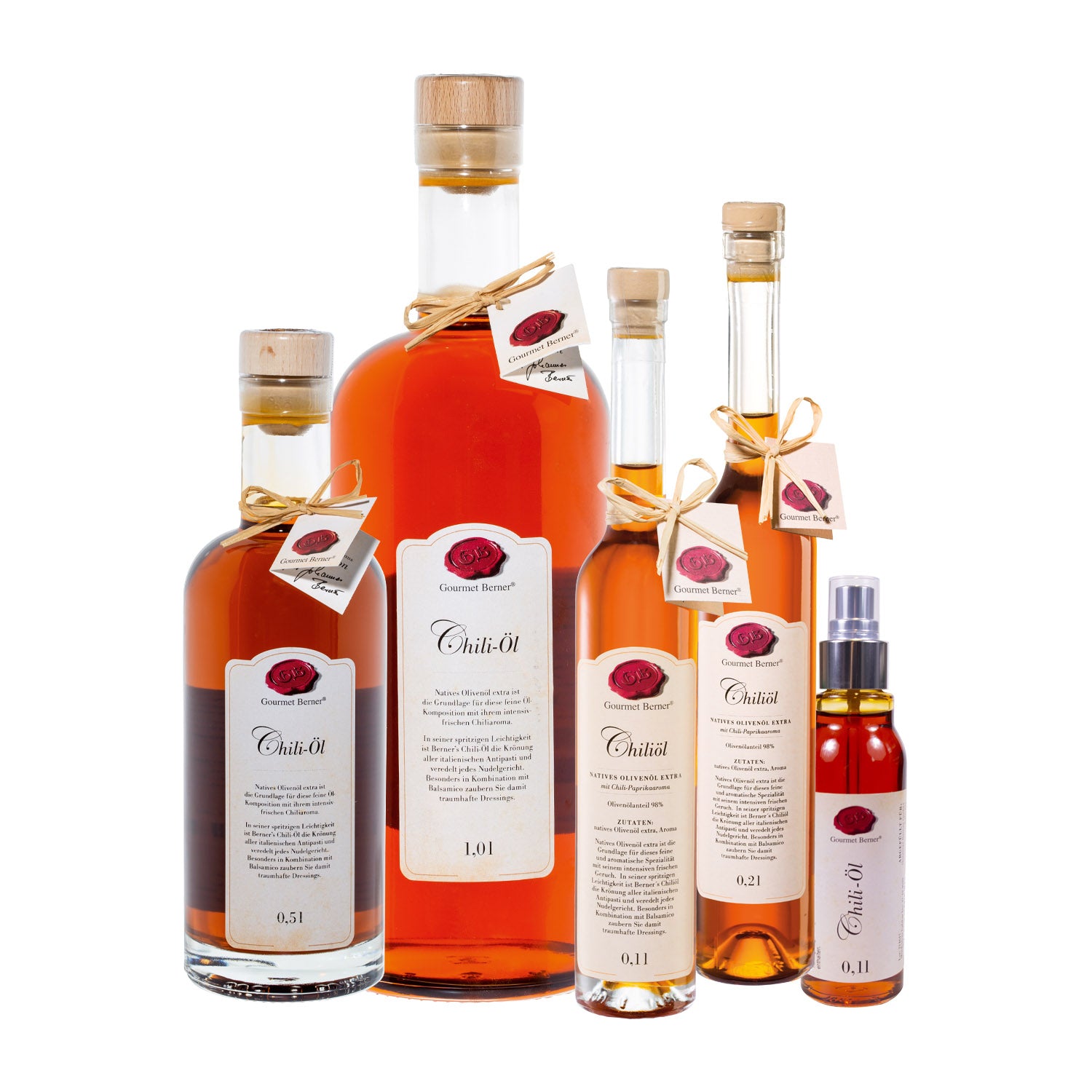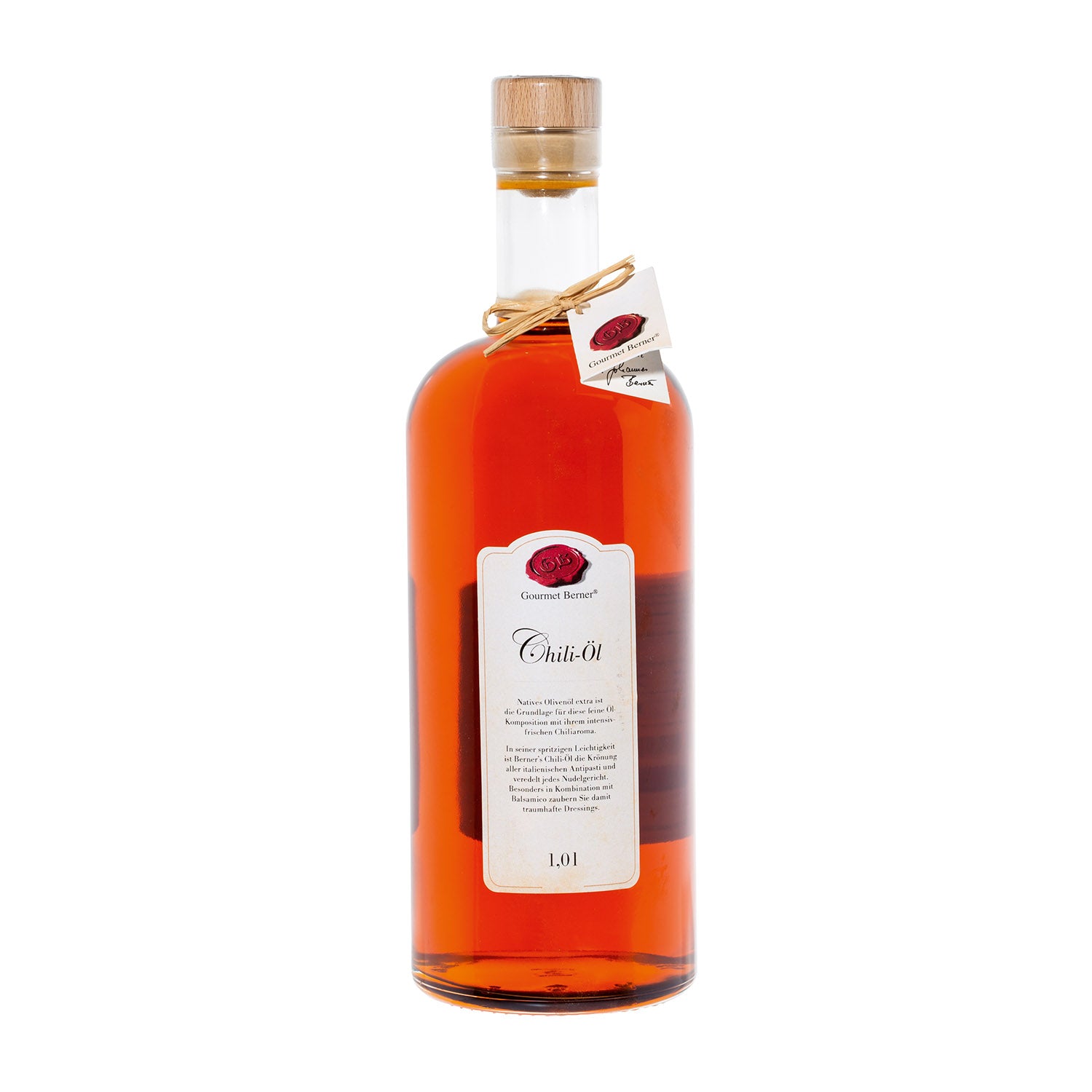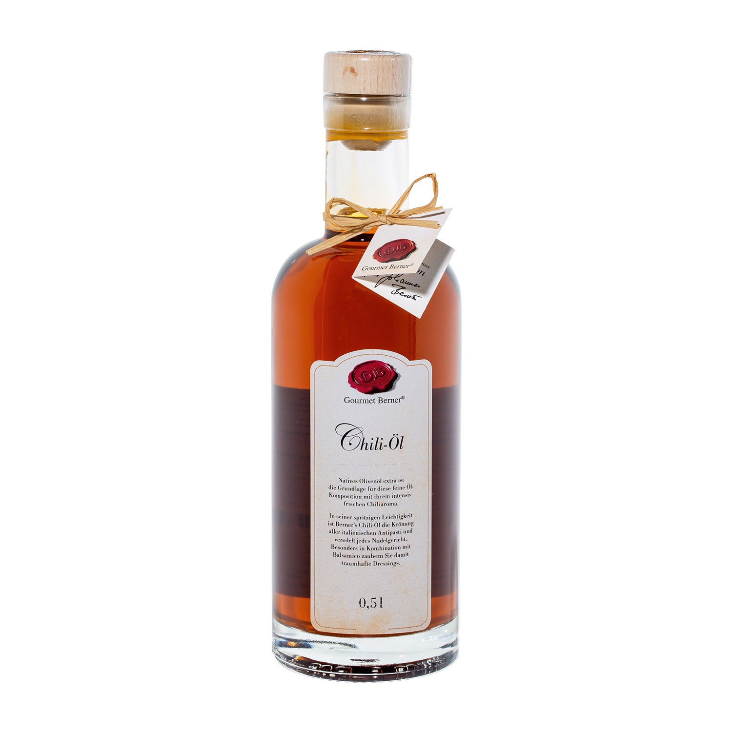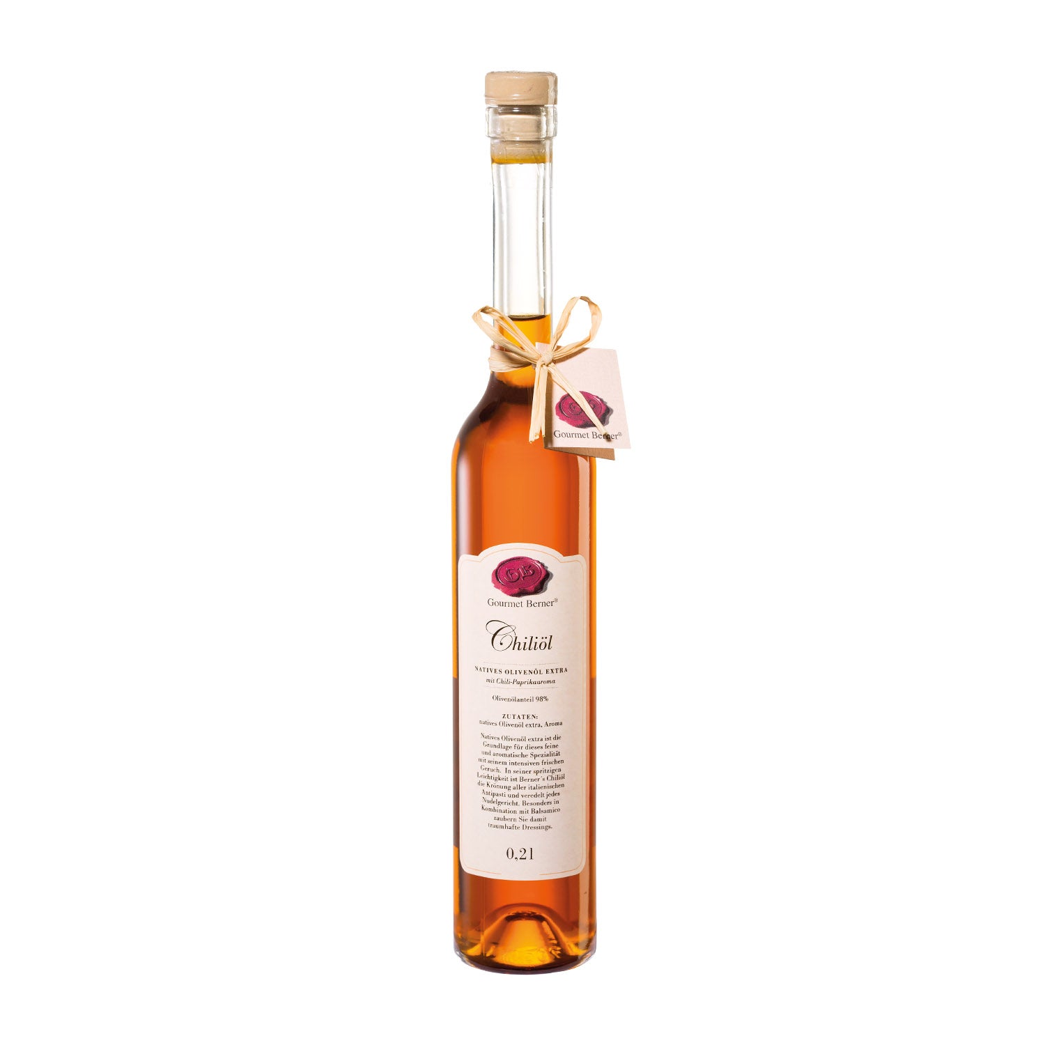 Chili-Öl, Komposition aus nativem Olivenöl extra (99%) mit Chiliaroma Natives Olivenöl extra ist die Grundlage für diese feine Öl-Komposition mit ihrem intensiv-frischen Chiliaroma. Mit seiner dezenten Schärfe ist Berners Chili-Öl die Krönung aller italienischen Antipasti und veredelt jedes Nudelgericht. Besonders in Kombination mit Balsamico zaubern Sie damit traumhafte Dressings.