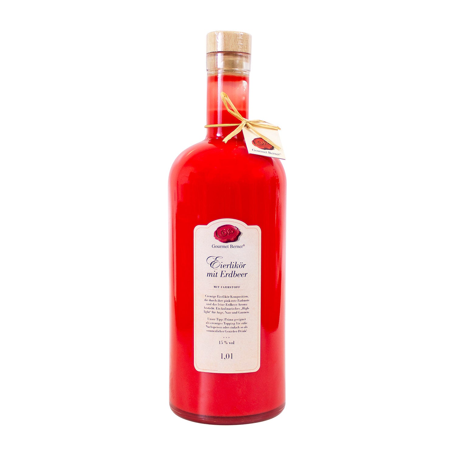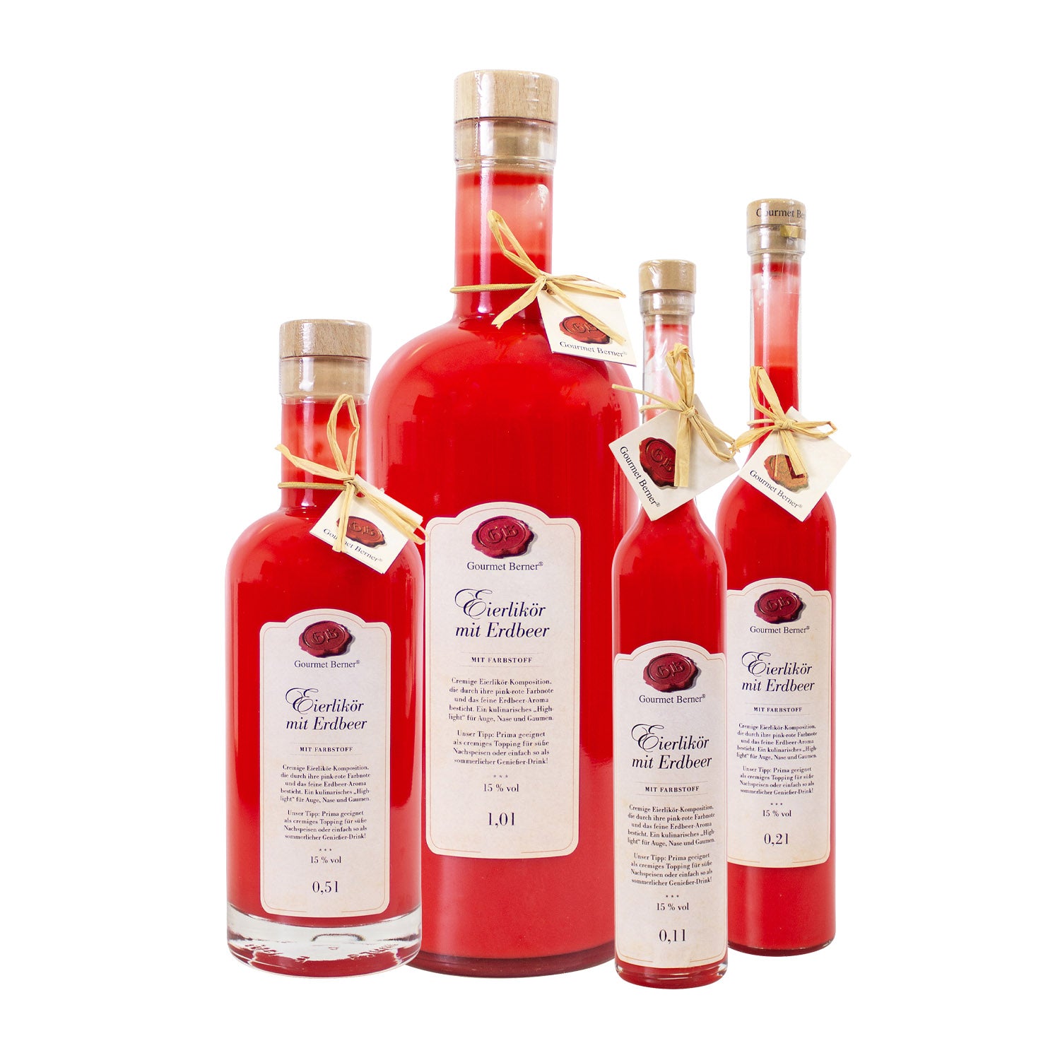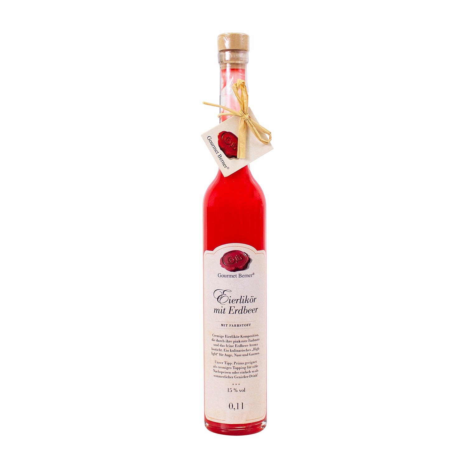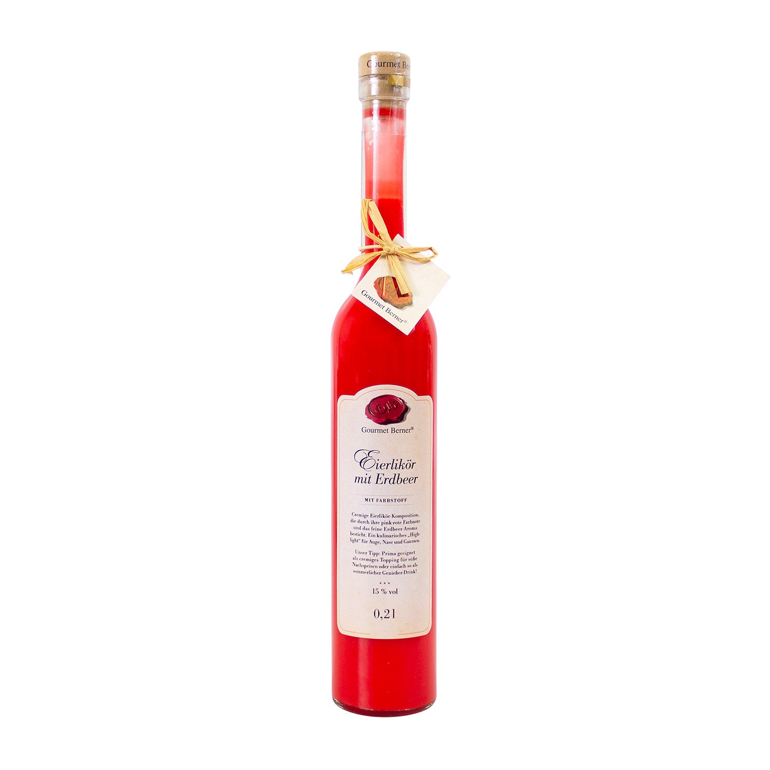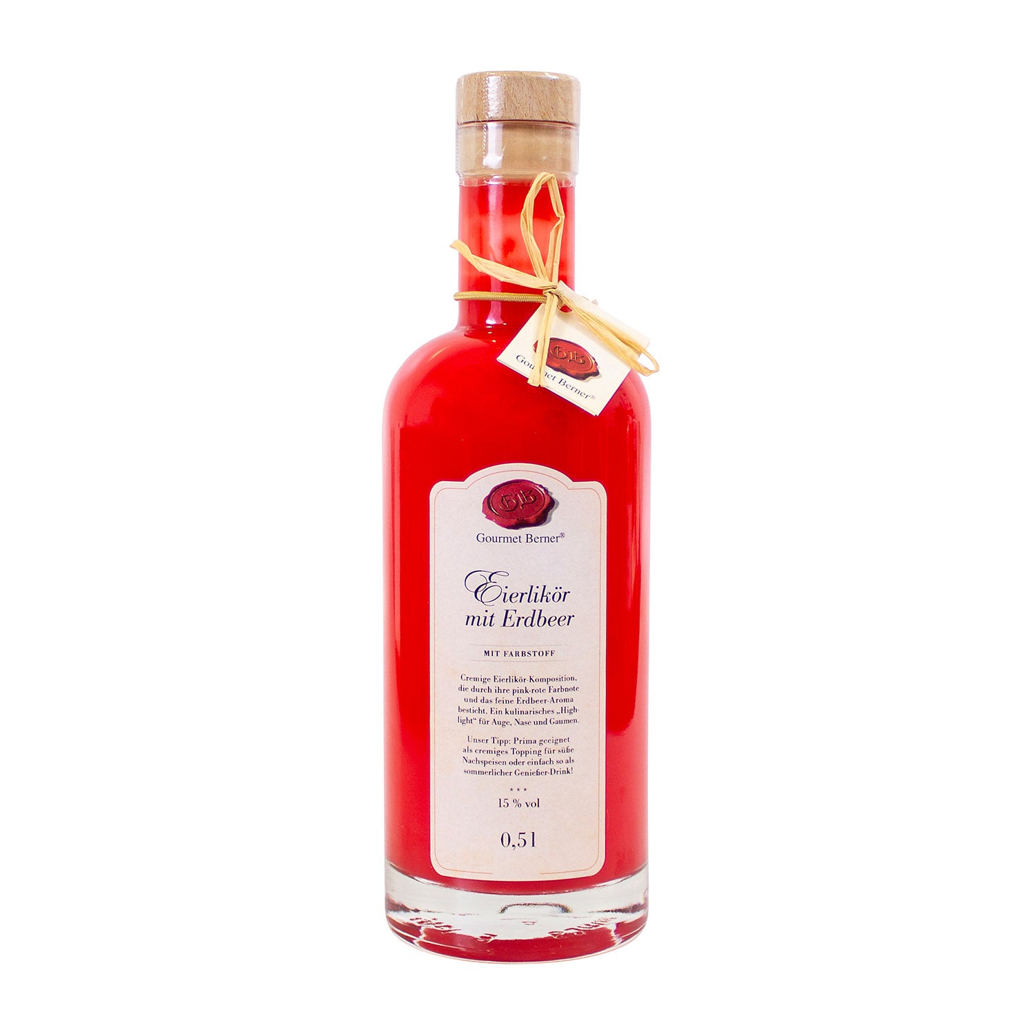 Eierlikör mit Erdbeer, Eierlikör mit Erdbeergeschmack Cremige Eierlikör-Komposition, die durch ihre pink-rote Farbnote und das feine Erdbeer-Aroma besticht. Ein kulinarisches Highlight für Auge, Nase und Gaumen. Unser Tipp: Prima geeignet als cremiges Topping für süße Nachspeisen oder einfach so als sommerlicher Genießer-Drink!
