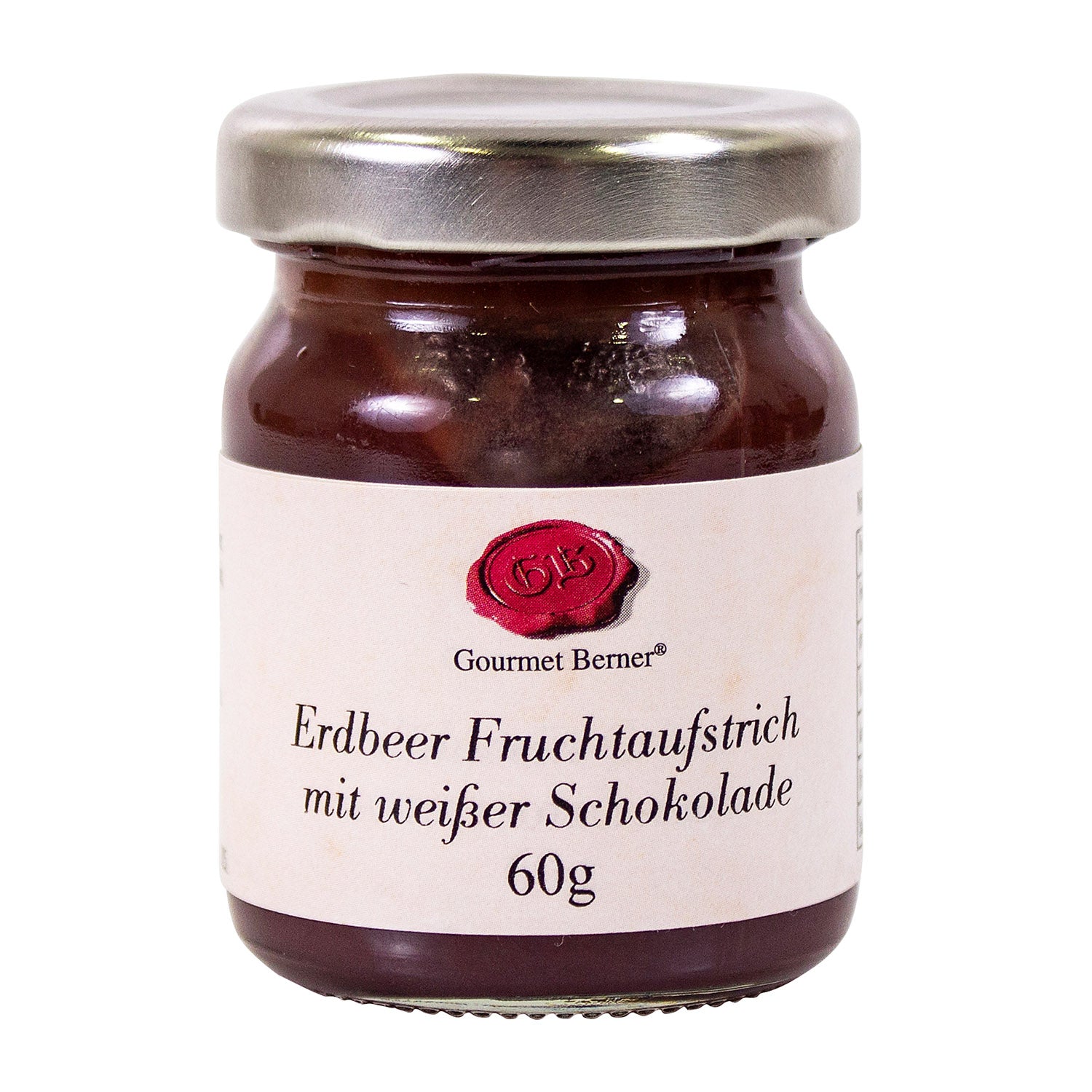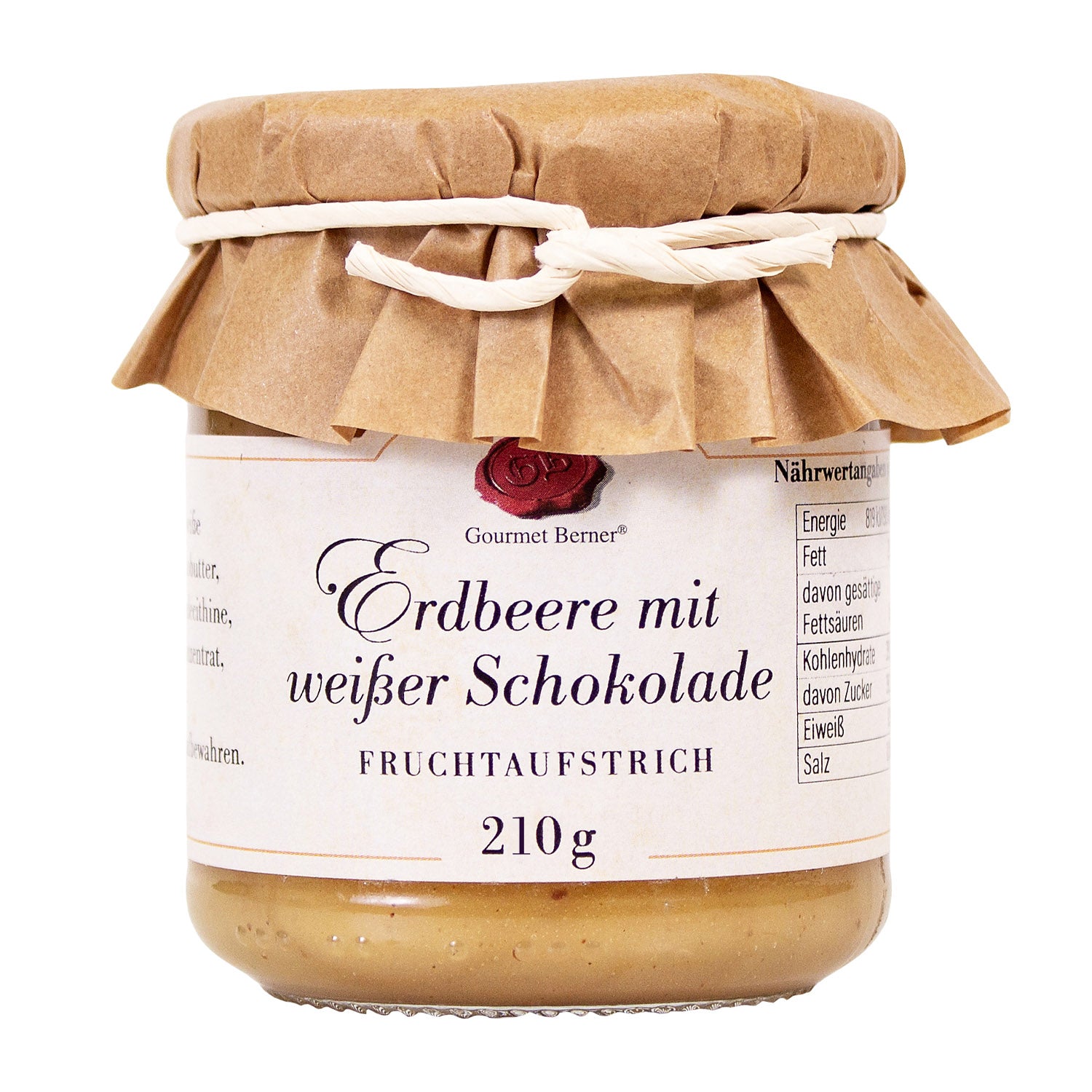 Erdbeeren (58%), Zucker, weiße Schokolade 6% (Zucker, Kakaobutter, Vollmilchpulver, Emulgator: Lecithine (Soja), Vanilleextrakt), Zitronensaftkonzentrat, Geliermittel: Pektine.