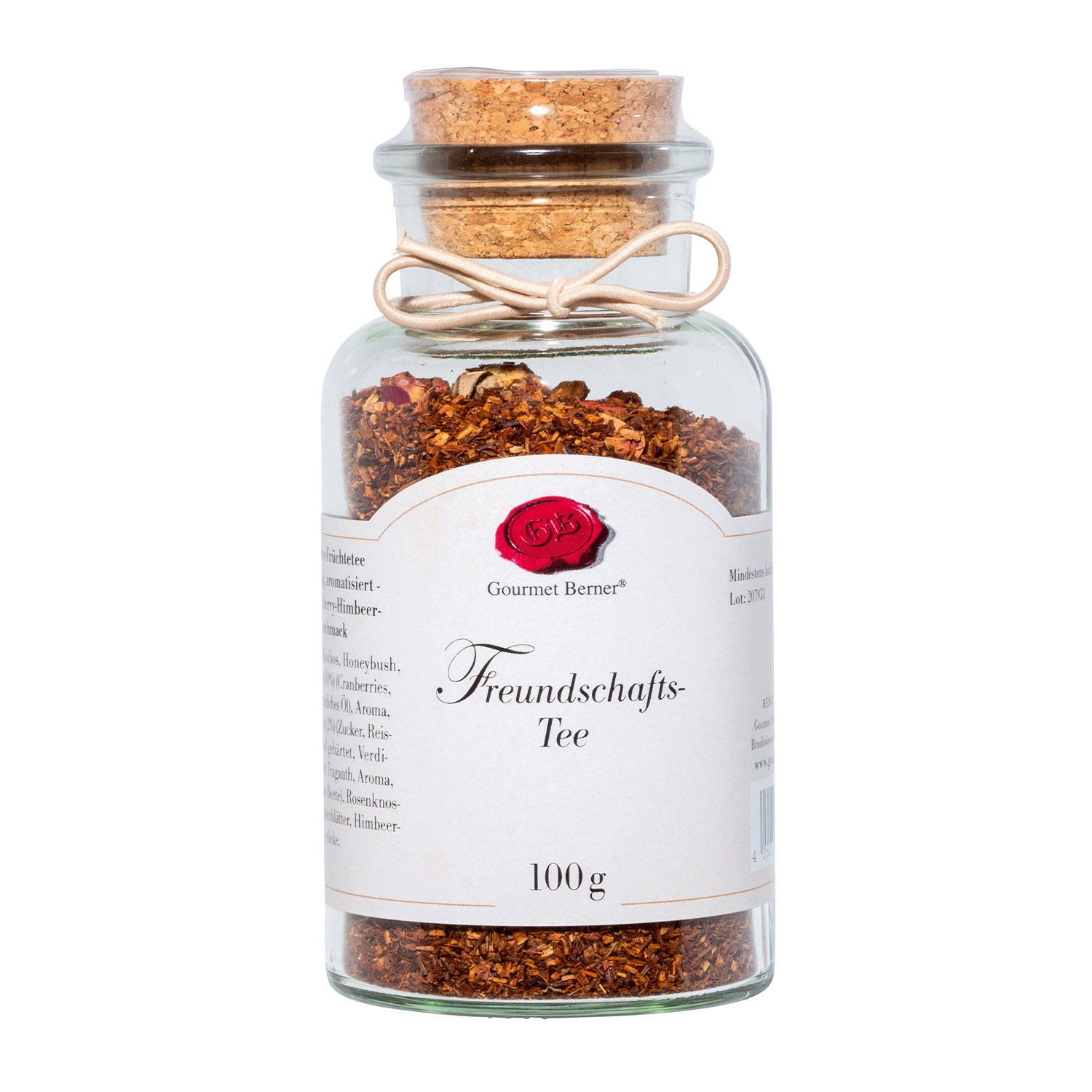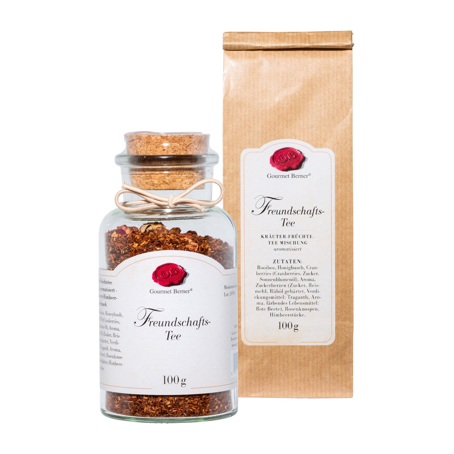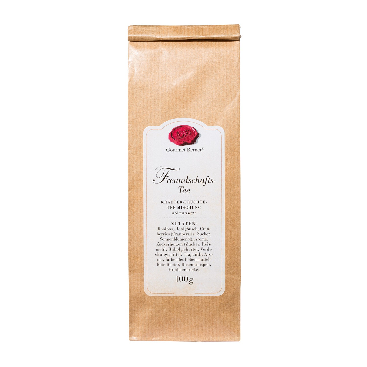 Freundschafts-Tee, Kräuter-Früchtetee Mischung, aromatisiert - mit Cranberry-Himbeer-GeschmackZiehzeit: 8 Minuten. Tee immer mit frischem, sprudelnd kochendem Wasser übergießen.