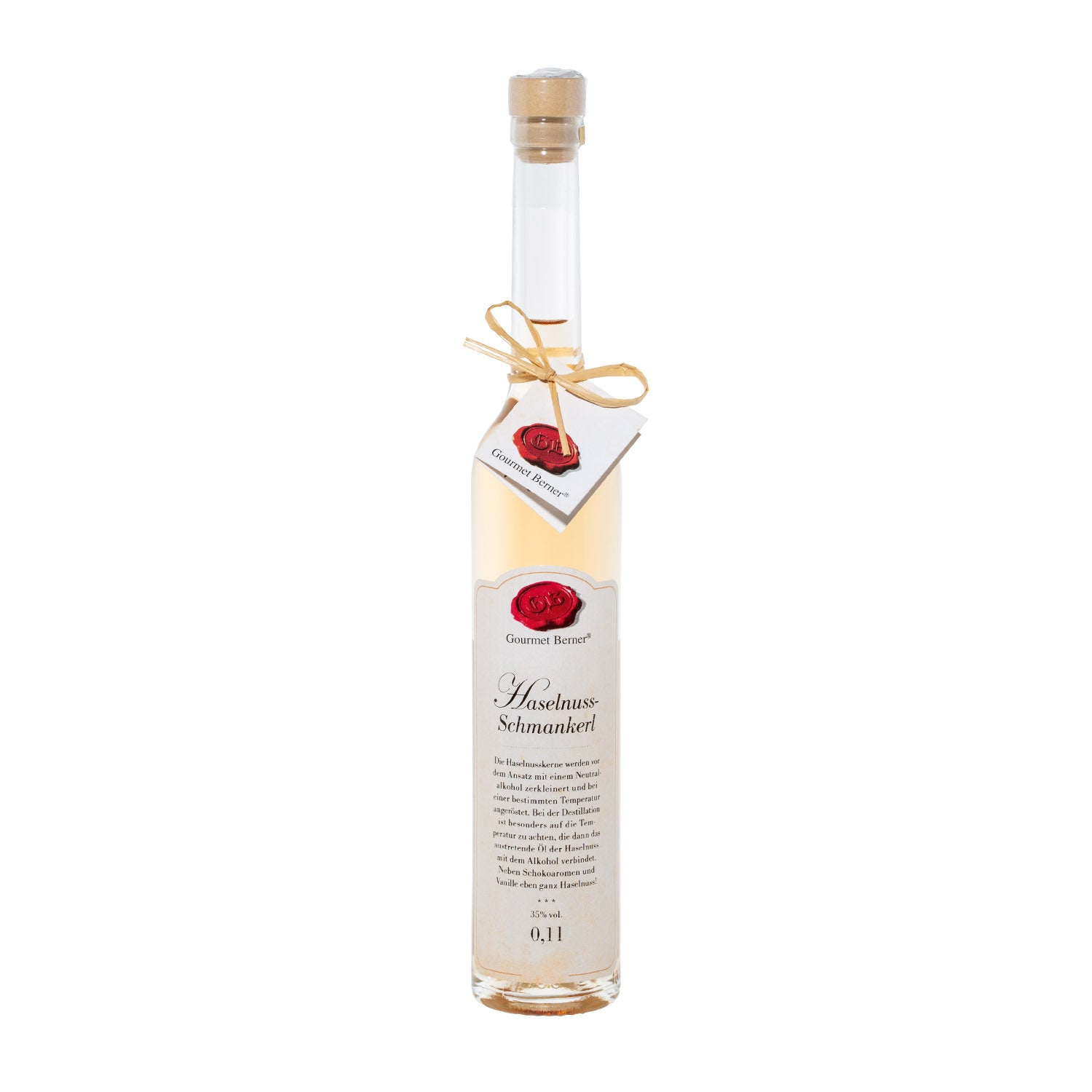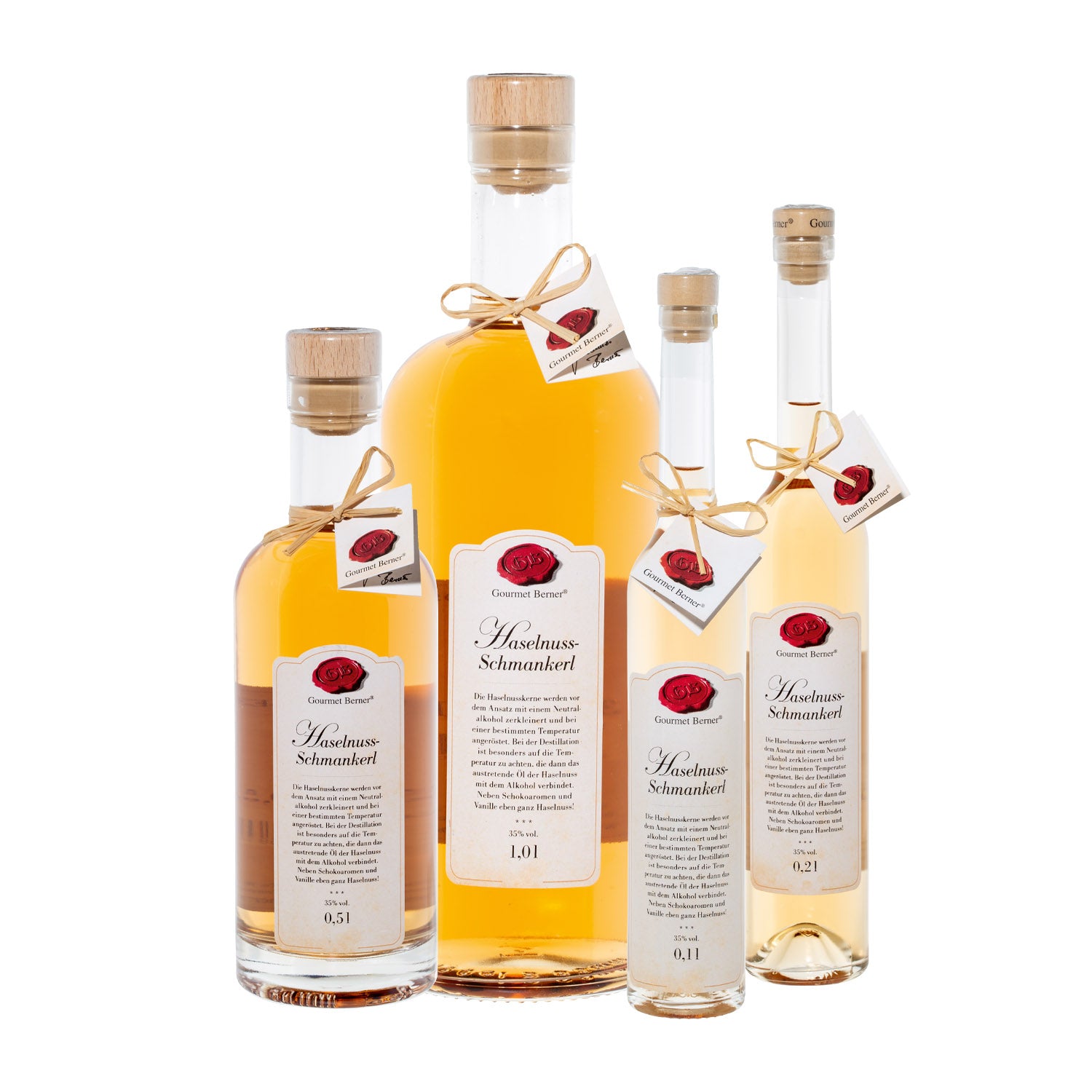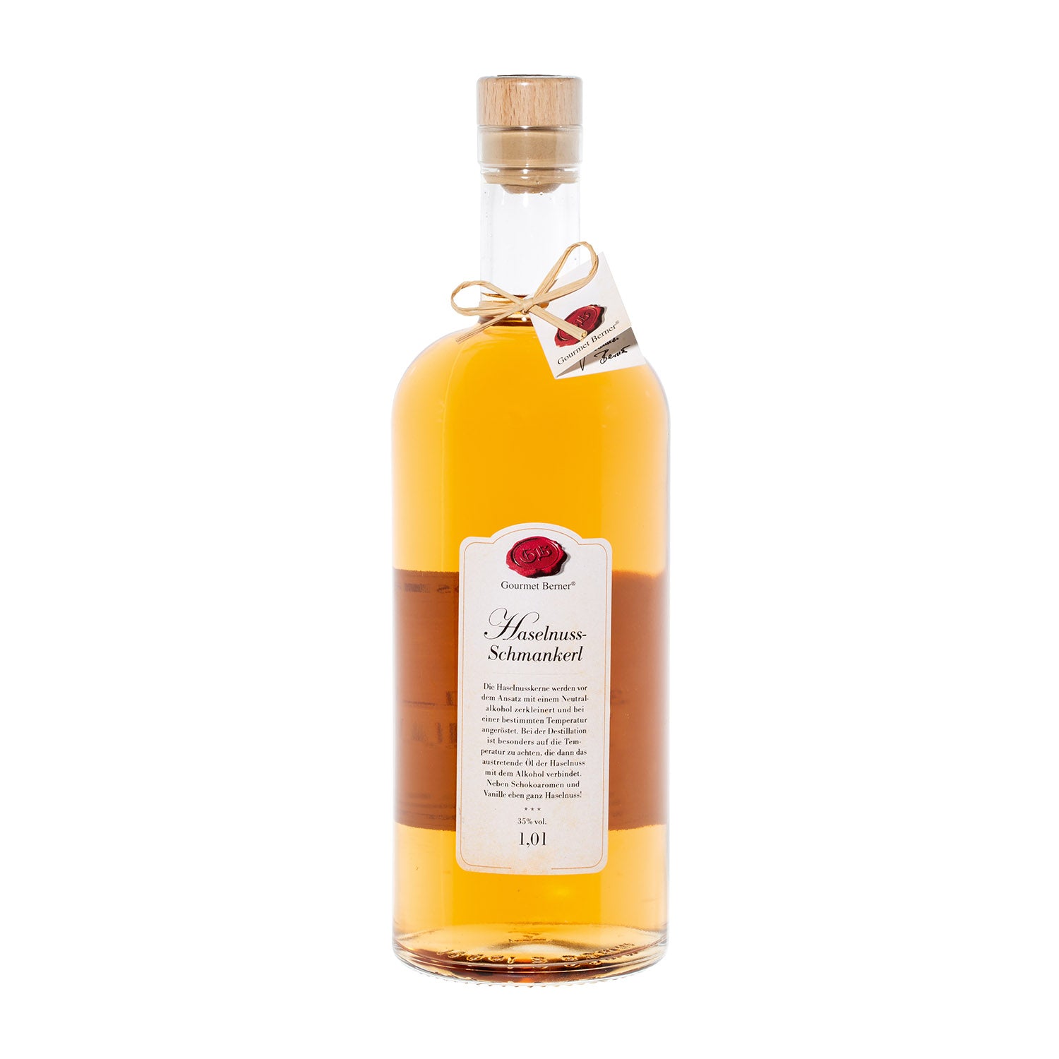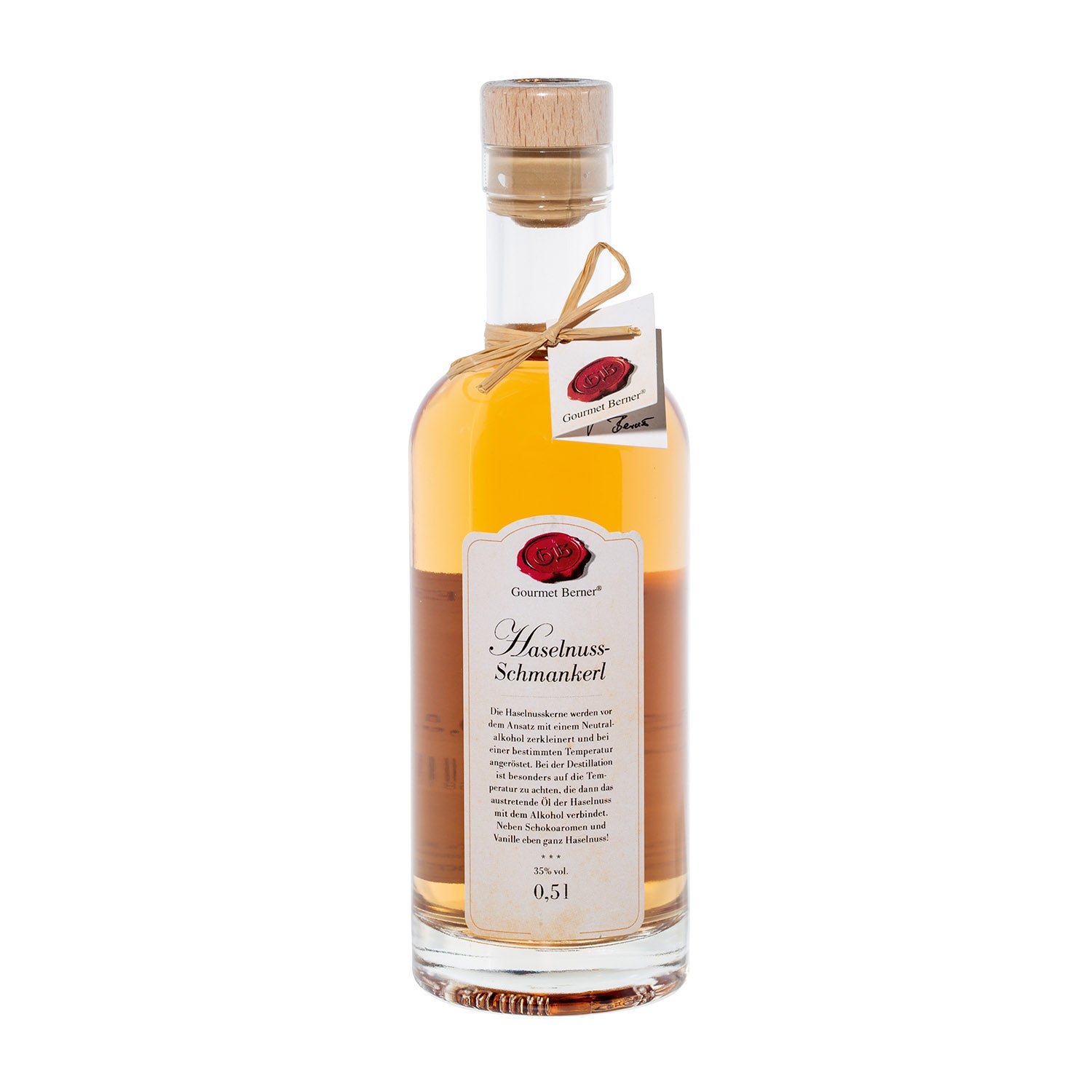 Haselnuss-Schmankerl, Spirituose Die Haselnusskerne werden vor dem Ansatz mit einem Neutralalkohol zerkleinert und bei einer bestimmten Temperatur angeröstet. Bei der Destillation ist besonders auf die Temperatur zu achten, die dann das austretende Öl der Haselnuss mit dem Alkohol verbindet. Neben Schokoaromen und Vanille eben ganz Haselnuss!