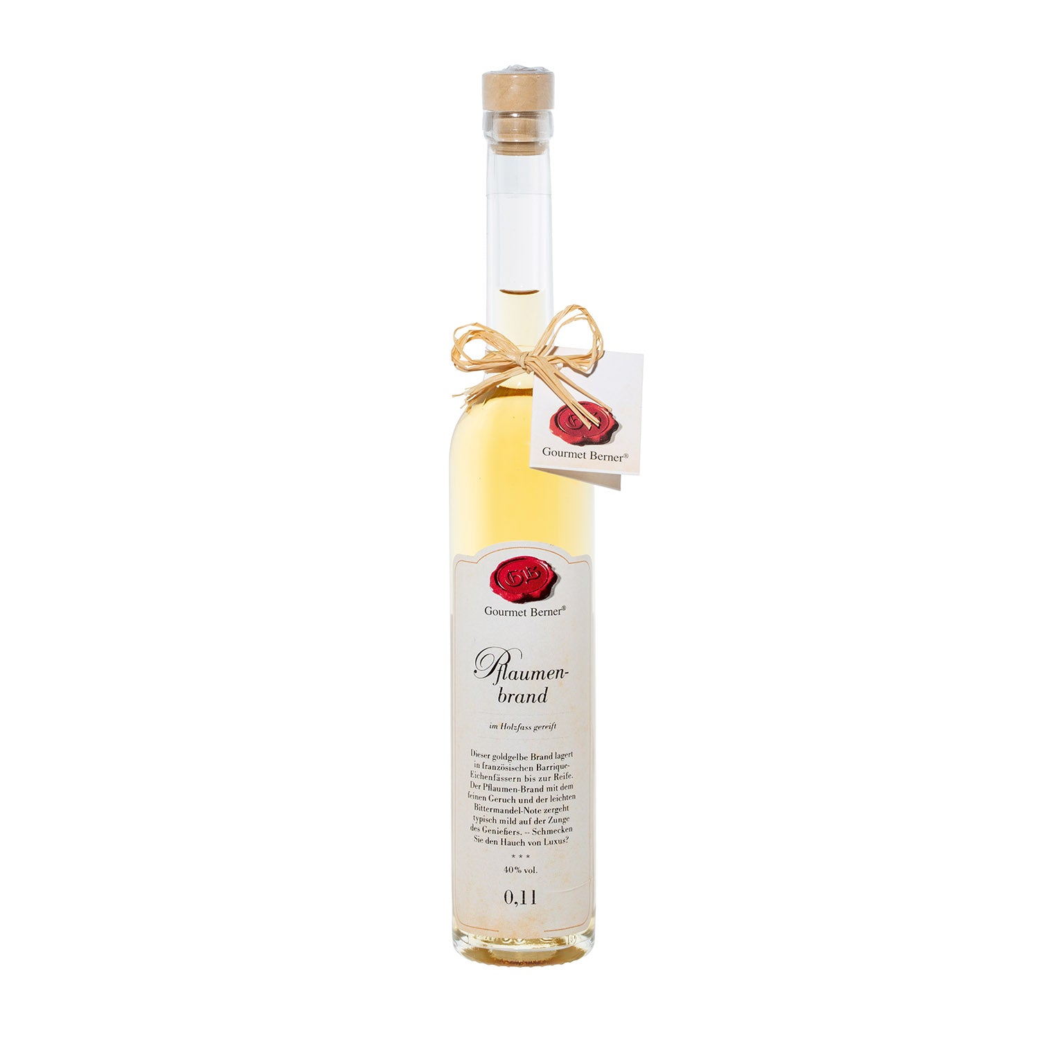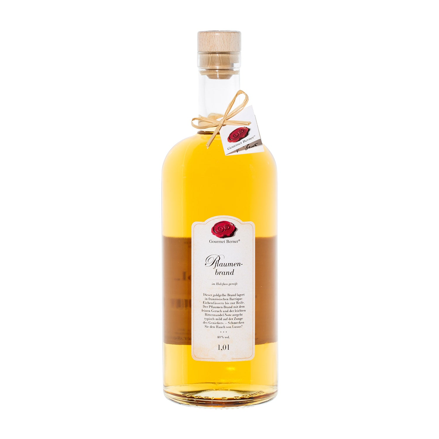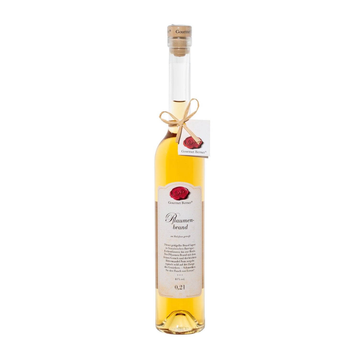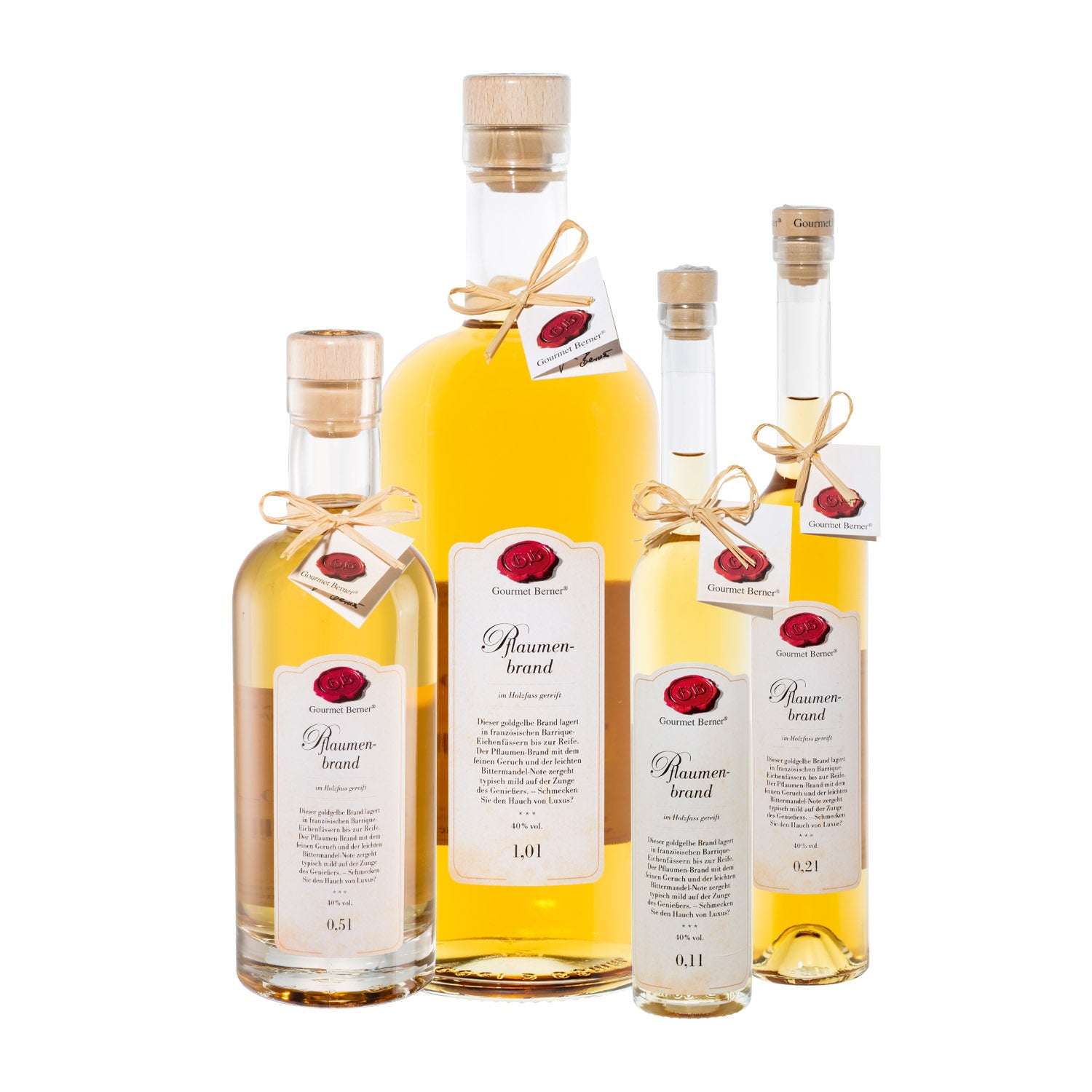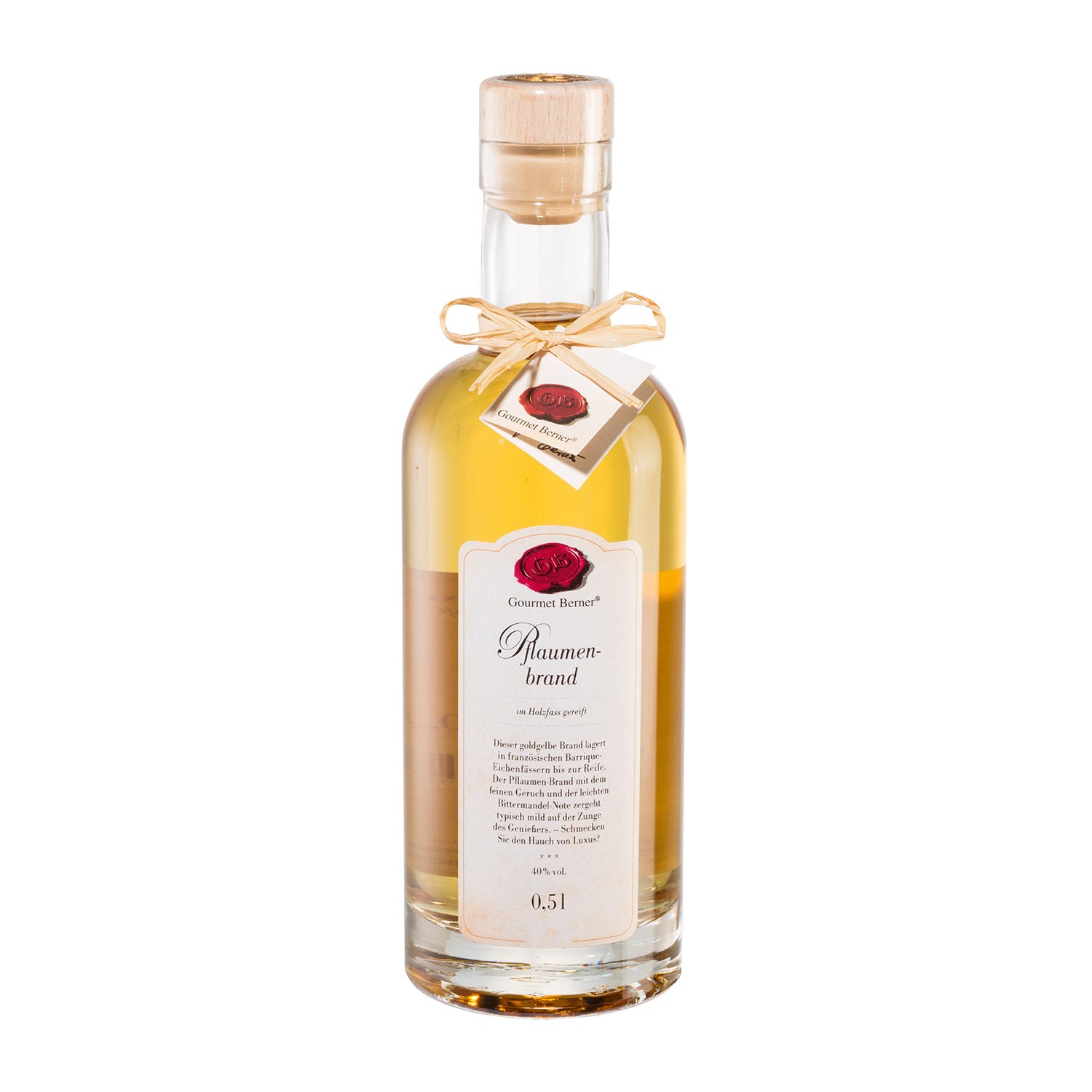 Pflaumenbrand, im Holzfass gereift Dieser goldgelbe Brand lagert in französischen Barrique-Eichenfässern bis zur Reife. Der Pflaumenbrand mit dem feinen Geruch und der leichten Bittermandel-Note zergeht typisch mild auf der Zunge des Genießers. Schmecken Sie den Hauch von Luxus?