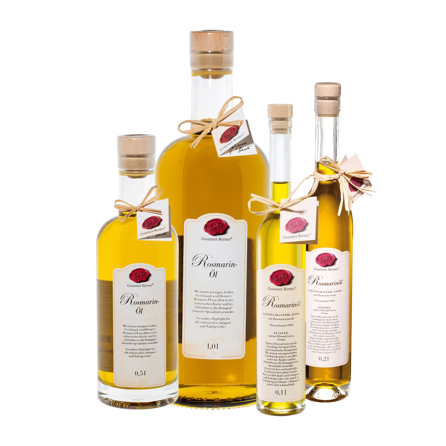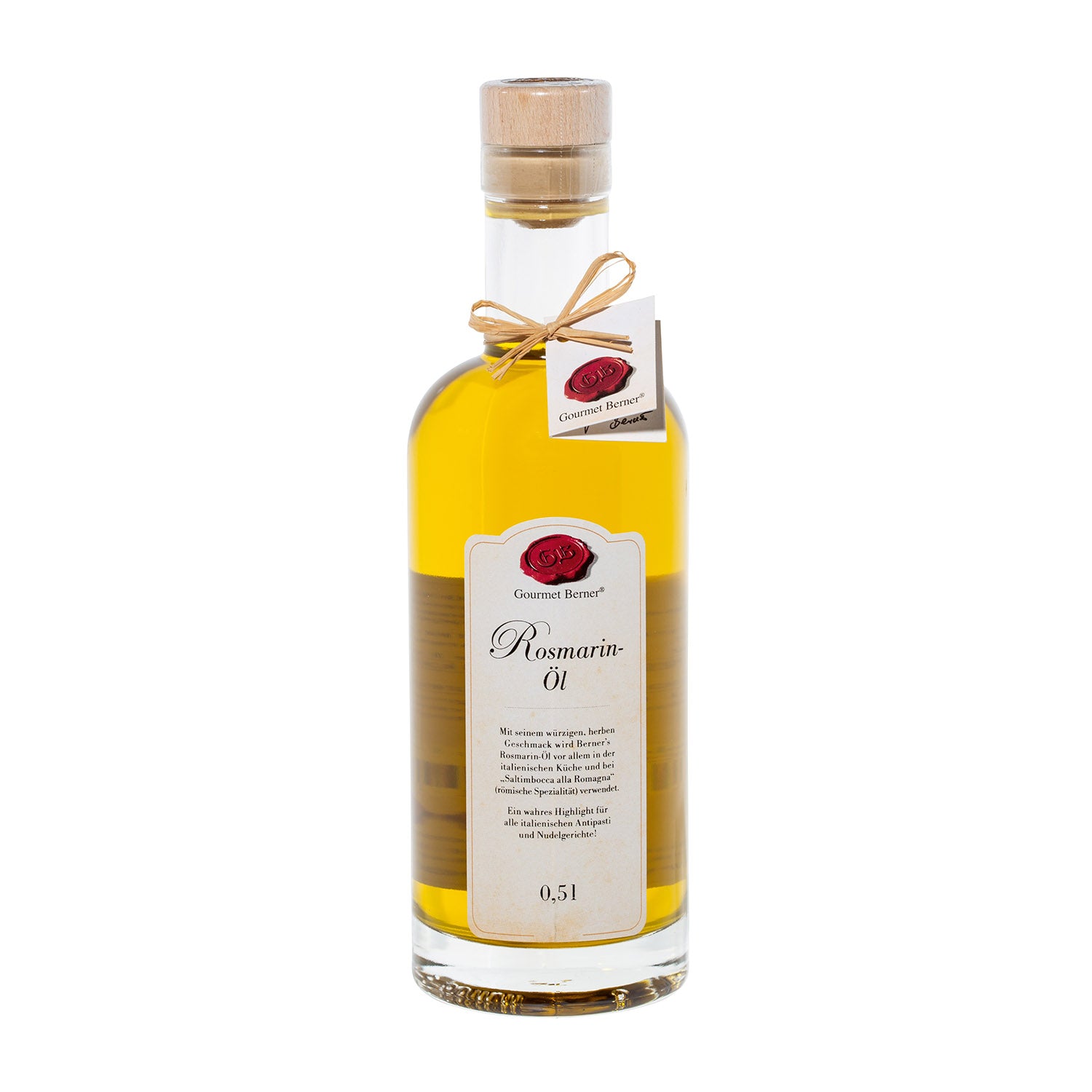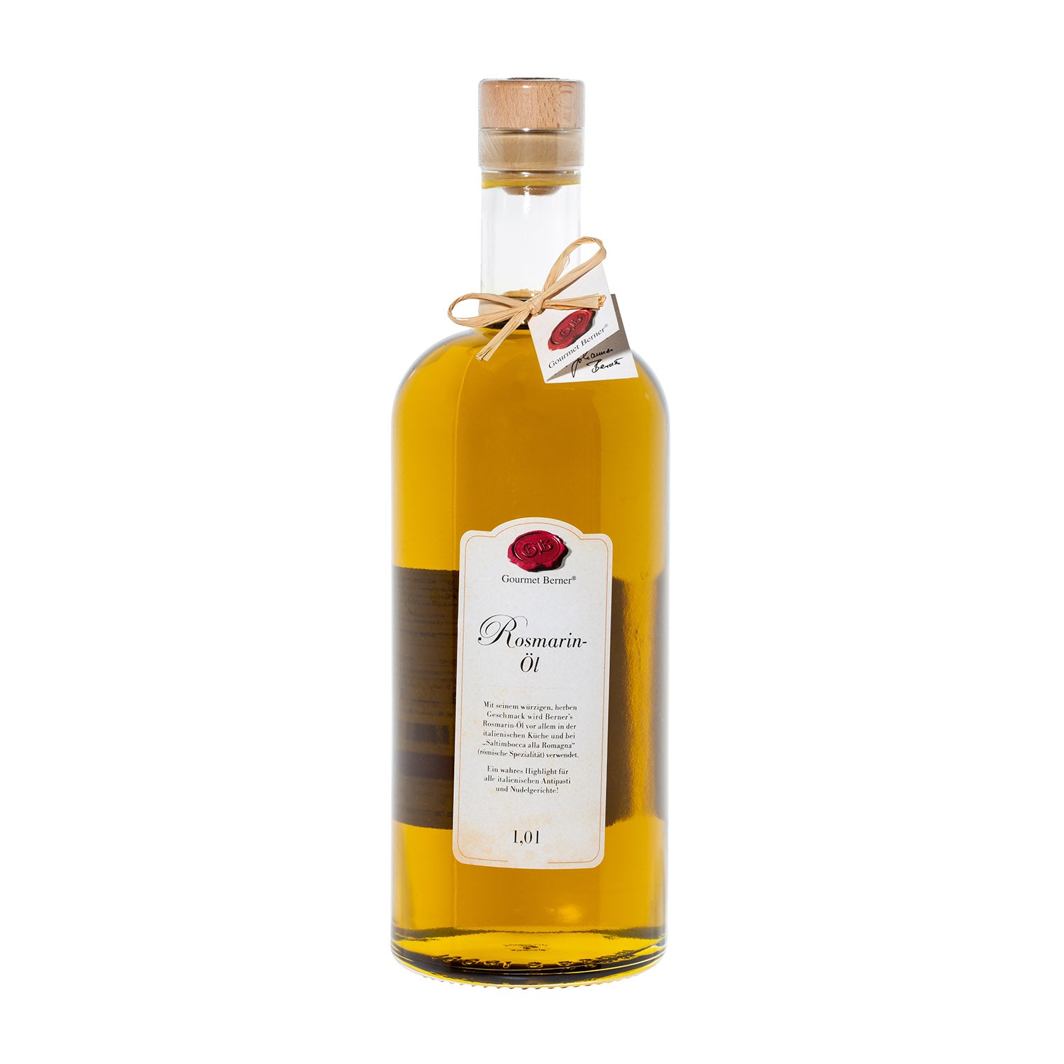Rosmarin-Öl, Komposition aus nativem Olivenöl extra (99%) mit Rosmarinaroma Natives Olivenöl extra ist die Grundlage für Berners Rosmarin-Öl. Mit seinem würzigen, herben Geschmack wird es vor allem in der italienischen Küche und bei "Saltimbocca alla Romagna" (römische Spezialität) verwendet. Ein wahres Highlight für alle italienischen Antipasti und Nudelgerichte!