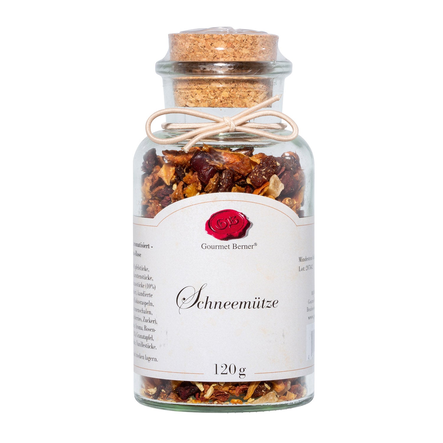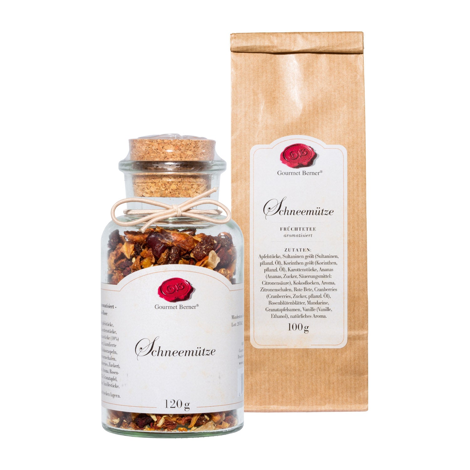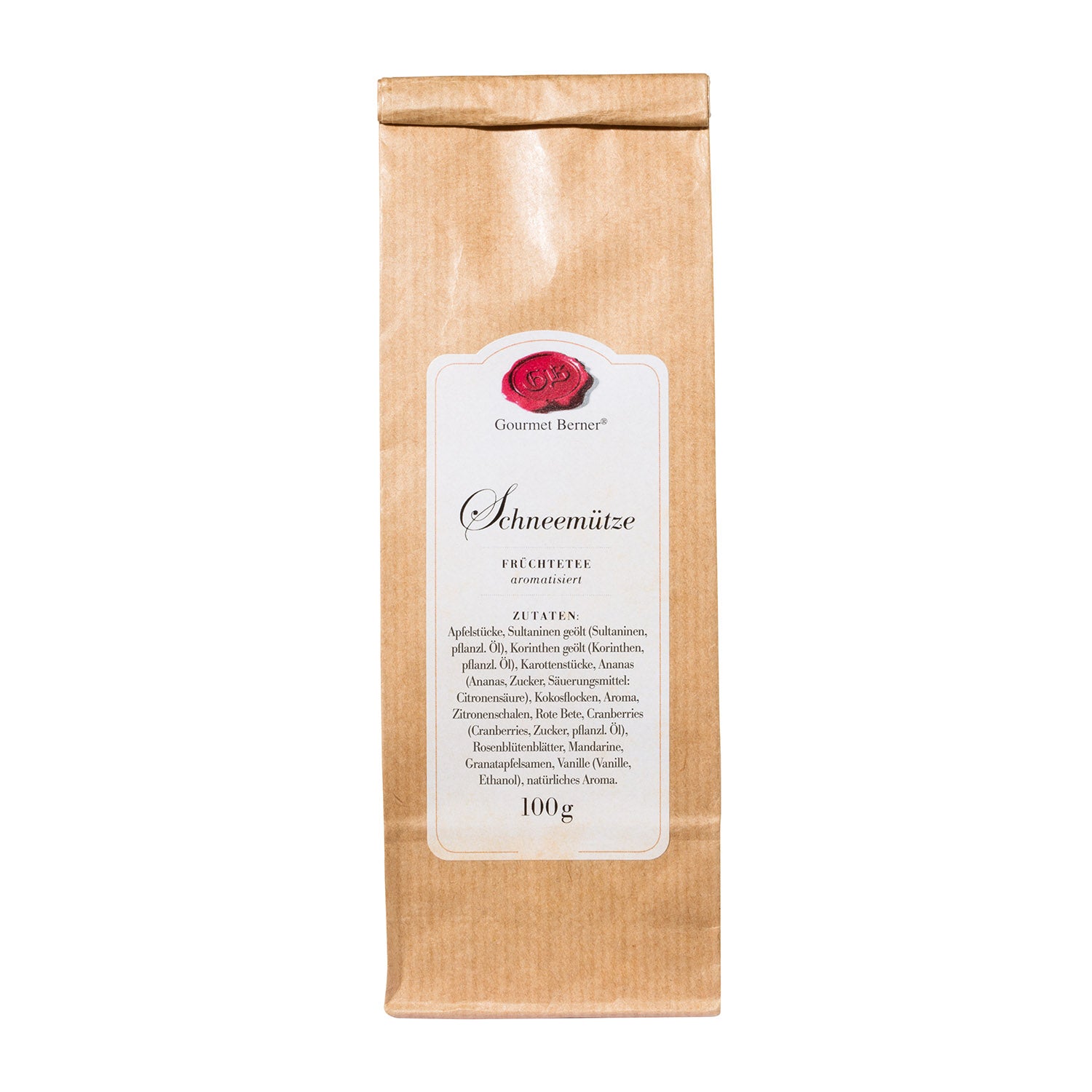Schneemütze, Früchtetee, aromatisiert - Ananas-Rose, enthält AlkoholZiehzeit: 6-8 Minuten. Tee immer mit frischem, sprudelnd kochendem Wasser übergießen.