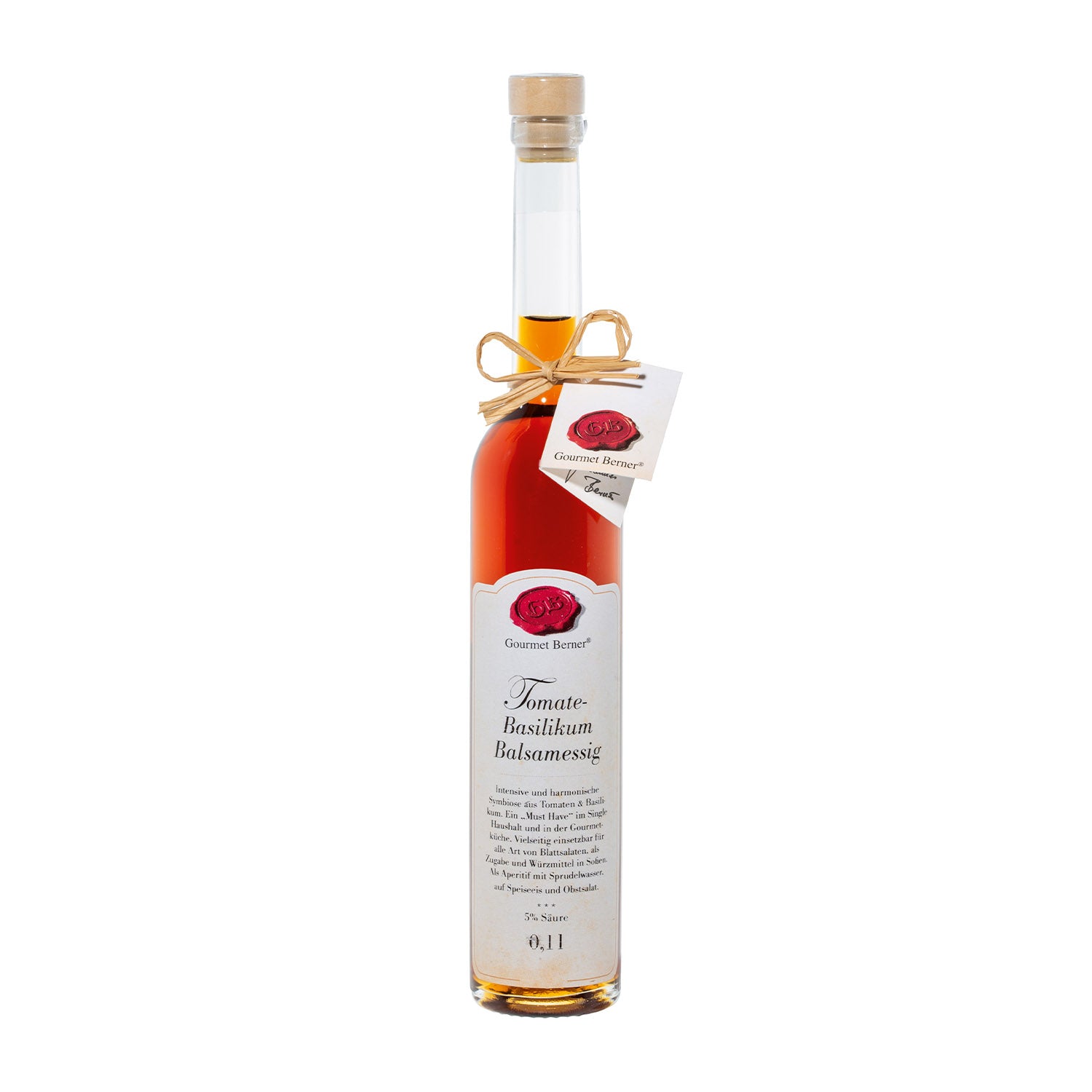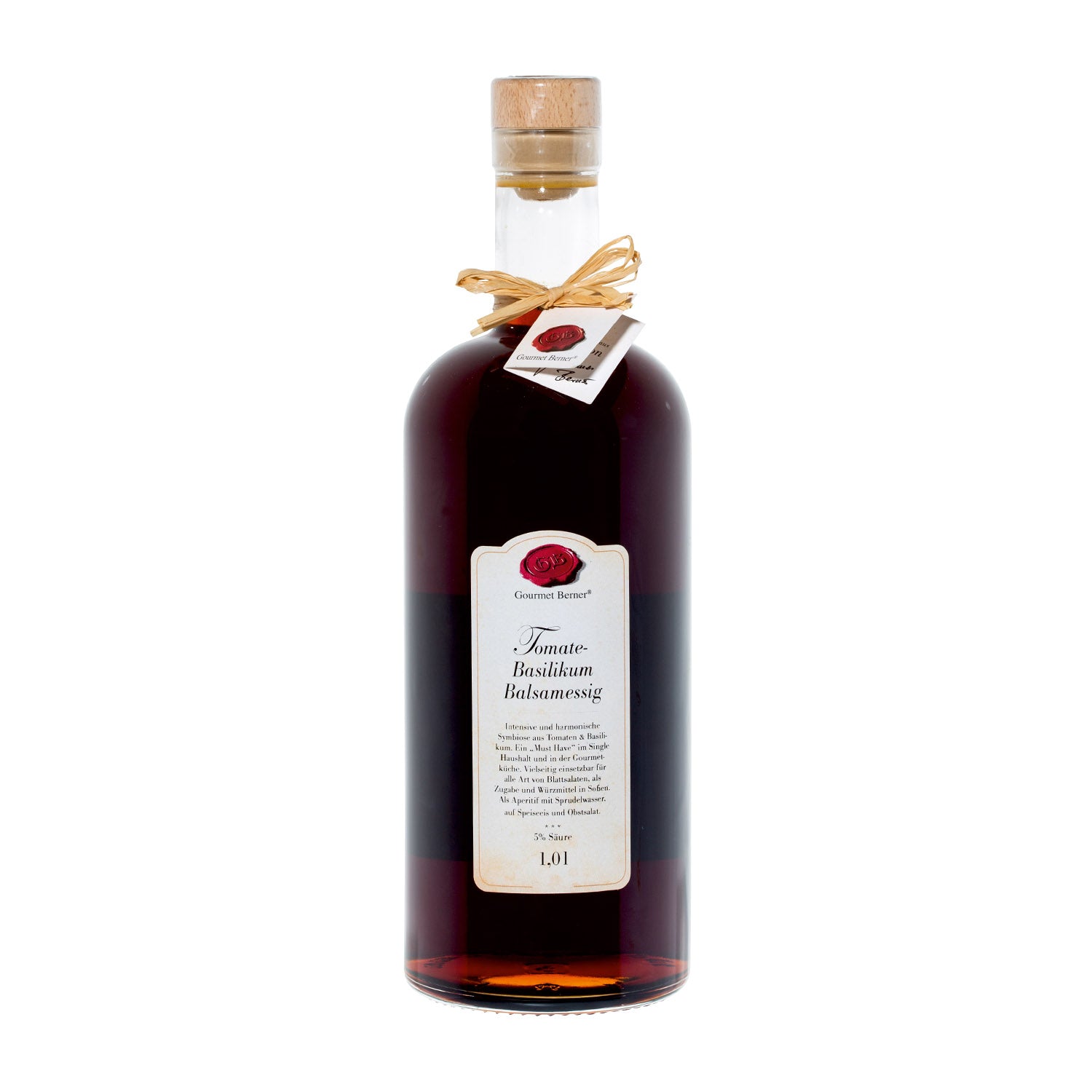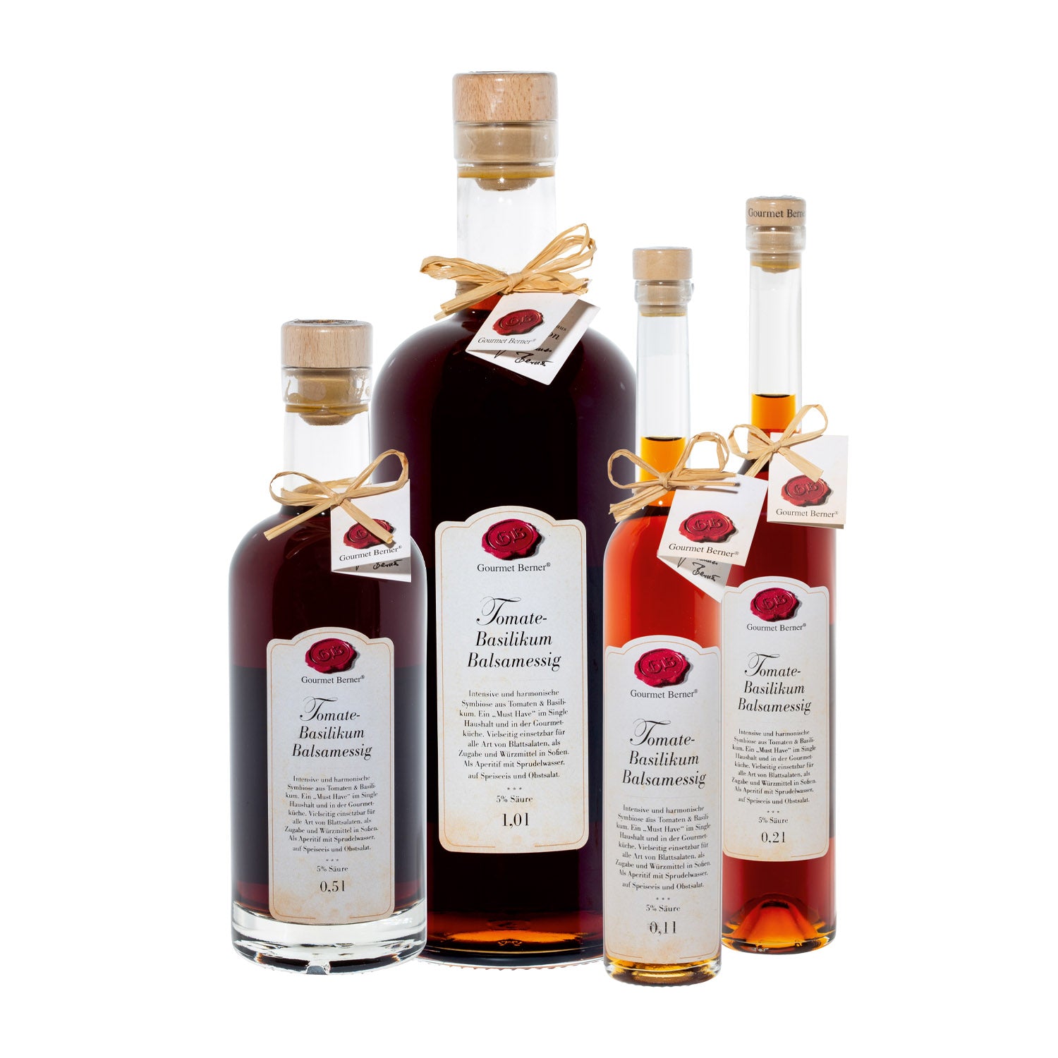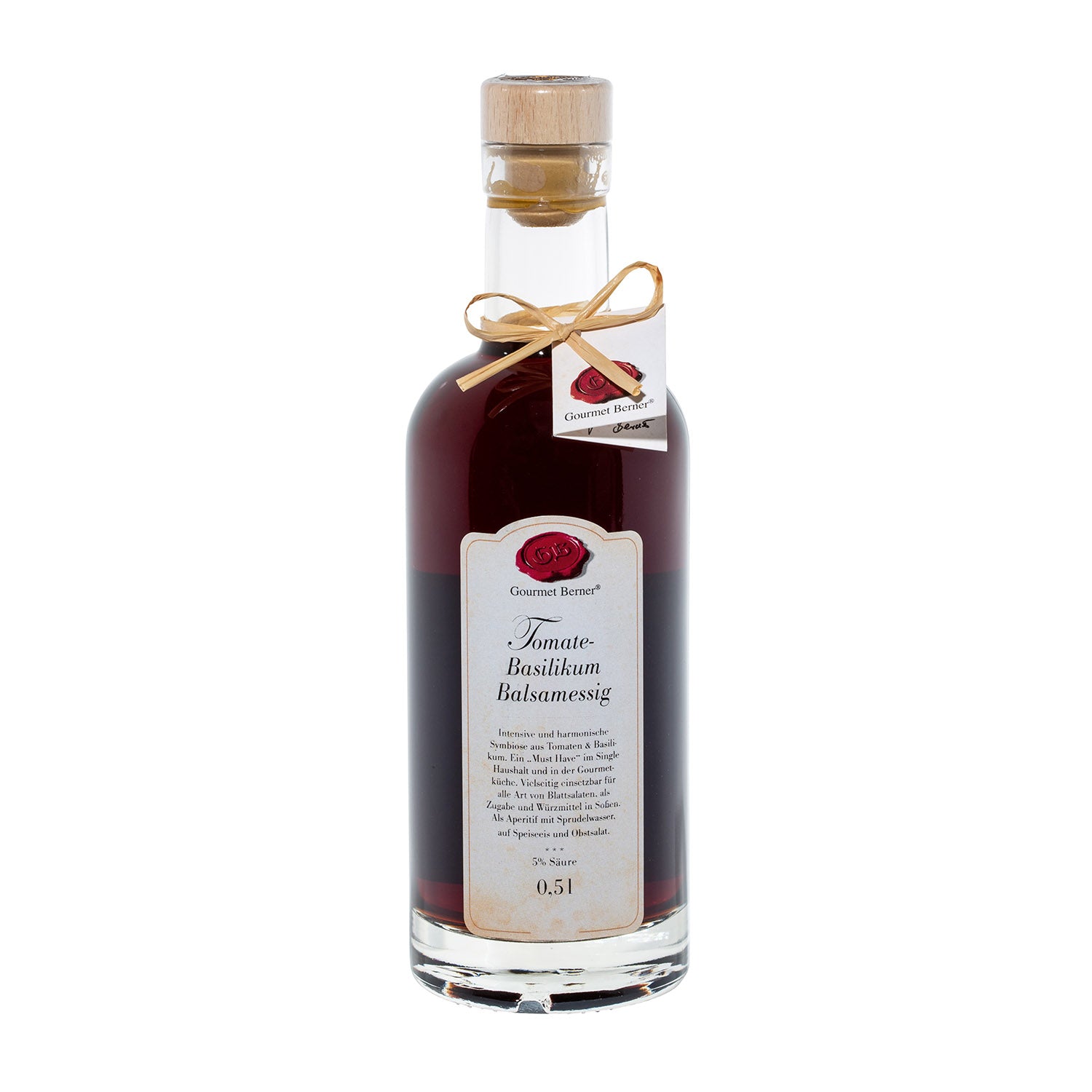 Tomate-Basilikum Balsamessig, Essig aus Weißweinessig mit Tomaten- & Basilikumaroma, 5% Säure Intensive und harmonische Symbiose aus Tomaten & Basilikum. Ein "Must-have" im Single Haushalt und in der Gourmetküche. Vielseitig einsetzbar für alle Art von Blattsalaten, als Zugabe und Würzmittel in Soßen. Als Aperitif mit Sprudelwasser, auf Speiseeis und Obstsalat.