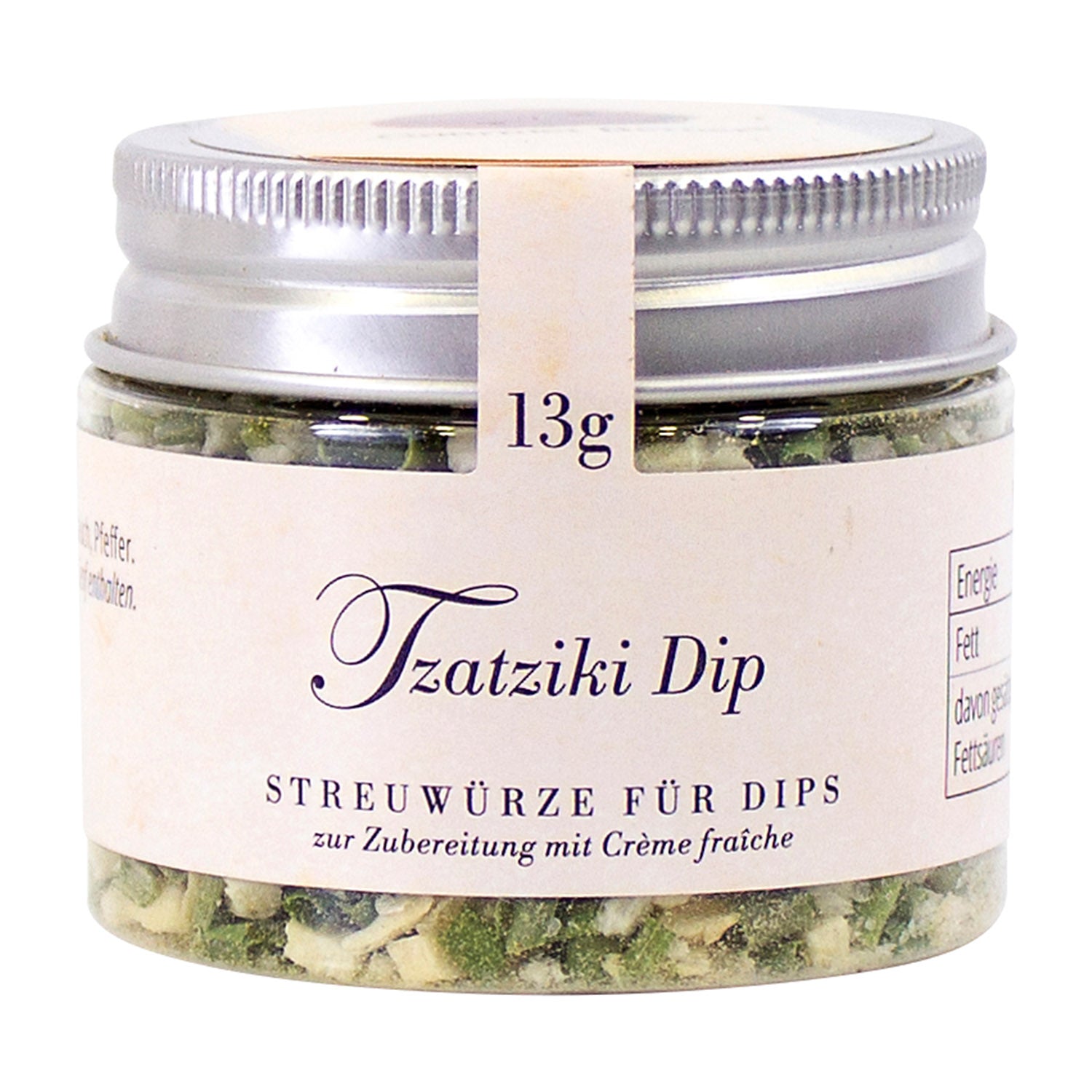 Tzatziki, Streuwürze für Dips Zubereitung: 200 g Crème Fraîche, Joghurt, Frischkäse, Sahnequark oder Schmand in einer kleinen Schüssel vorlegen und einen gehäuften Esslöffel der Gewürzmischung dazu geben. Gut umrühren und nach Belieben und je nach Saison mit weiteren Zutaten verfeinern.